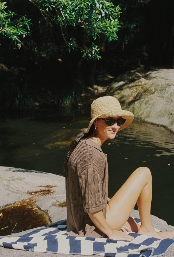 Montana wears the Raffia Bucket Hat with the Clemence Crochet Shirt in Dune.