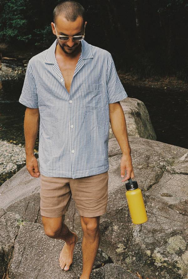 Ambrose wears the Ollie Seersucker Shirt with the Transition Short in Dune.
