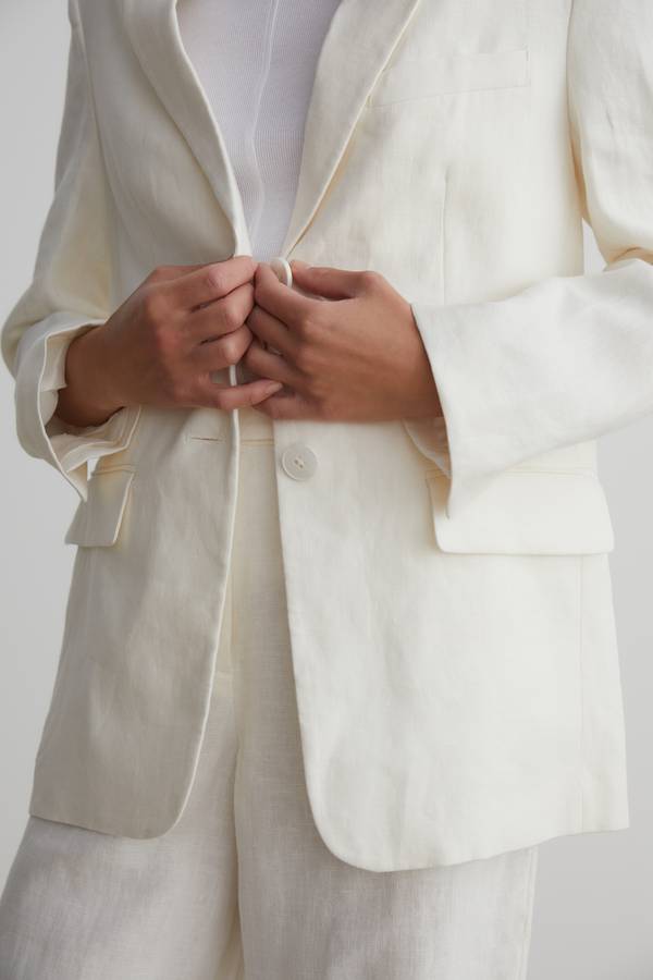 Model wears the Leila Linen Blazer and Pant in Antique White