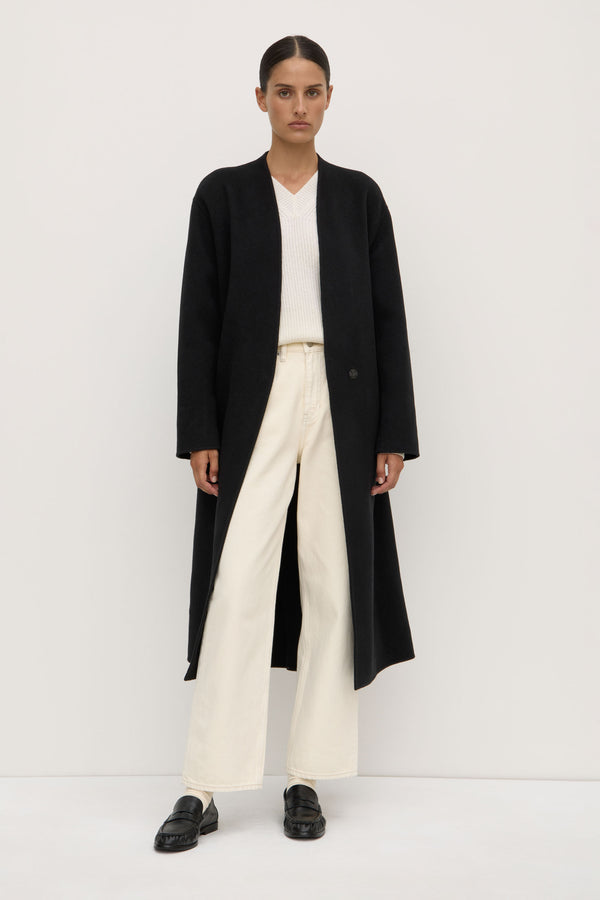 A collarless style coat, crafted from 100% wool, featuring a 100% leather cord belt.